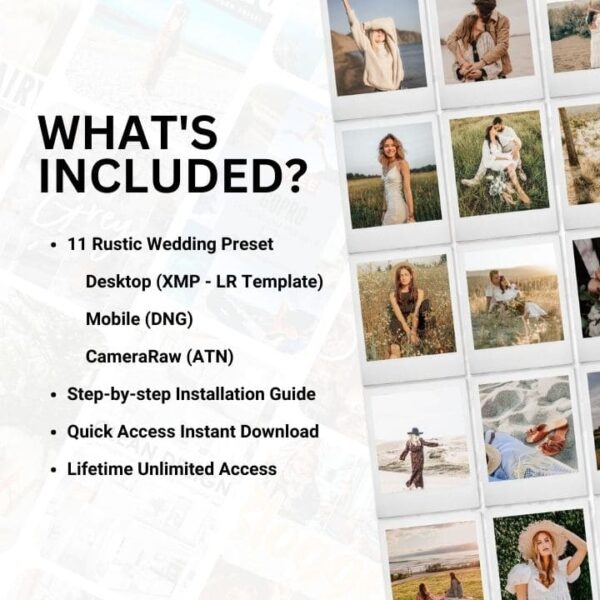 With our presets, you’re not just buying a product; you’re investing in a transformative tool that will elevate your photography to new heights. Don’t settle for ordinary. Choose extraordinary. Choose Rustic Wedding Lightroom Presets.